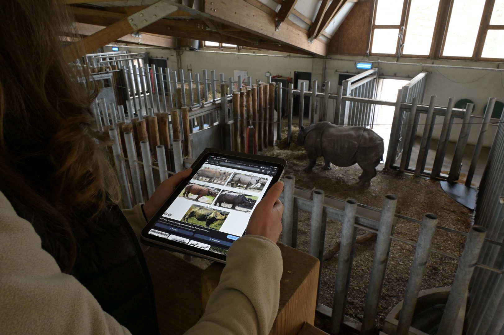 Flore Viallard réalisant une note d’état corporel sur un rhinocéros du parc de Branféré. « Lors des audits, entre trois et dix espèces sont échantillonnées. »